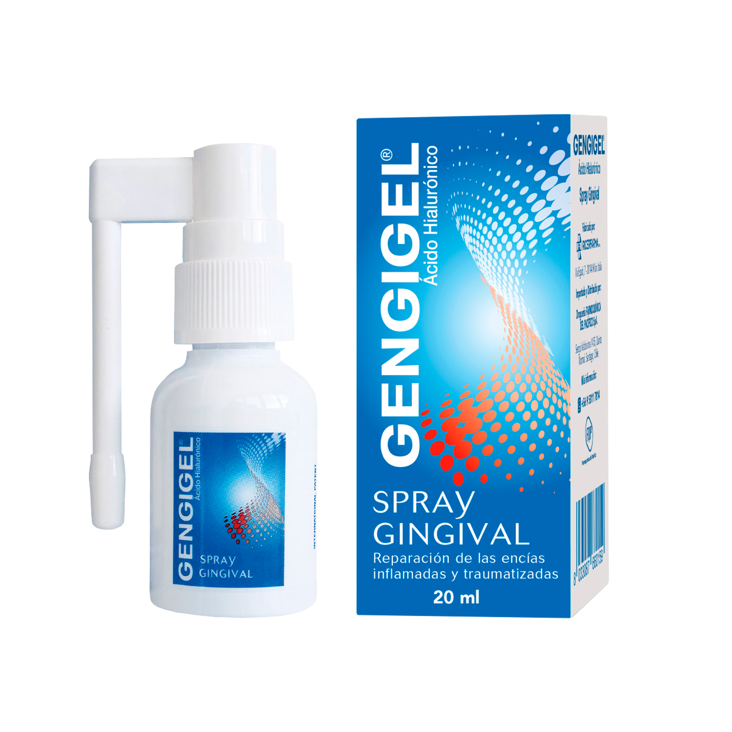 Es un spray desarrollado con una innovadora matriz de polímeros mucoadhesivos de tecnología patentada, diseñada para asegurar una adherencia a la mucosa gingival, formando una invisible, flexible, y fuerte película que ejerce una efectiva acción protectora. Gengigel Spray es especialmente conveniente para su aplicación en áreas de la boca doloridas o de difícil acceso. Es una solución rápida y eficaz para gingivitis (inflamación y encías sangrantes), periodontitis (bolsas gingivales), traumatismo de las encías, consecuencia de la cirugía dental (abrasiones, extracciones dentales, limpieza profunda de bolsas gingivales, etc.), aftas.